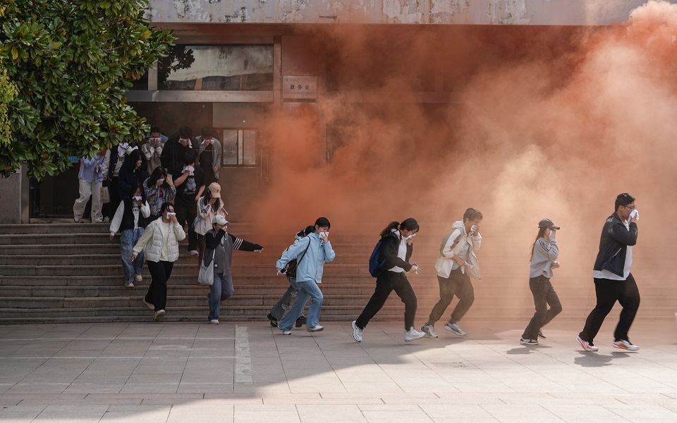 本次文化节活动采用1+N模式,涵盖了五个篇章30项活动内容,覆盖情景剧、文创作品、各类宣讲等多元形式,贯穿全年、分层分类、全员覆盖。活动现场开展了应急疏散演练。演练模拟教学楼A区突发火情,学校随即启动应急预案,依次开展初起火灾处置、人员紧急疏散、报警求援等流程,城阳区消防救援局迅速到场协同处置。7个专项工作组、200余名学生全程参与演练,在实战化场景中掌握火场逃生技能。
